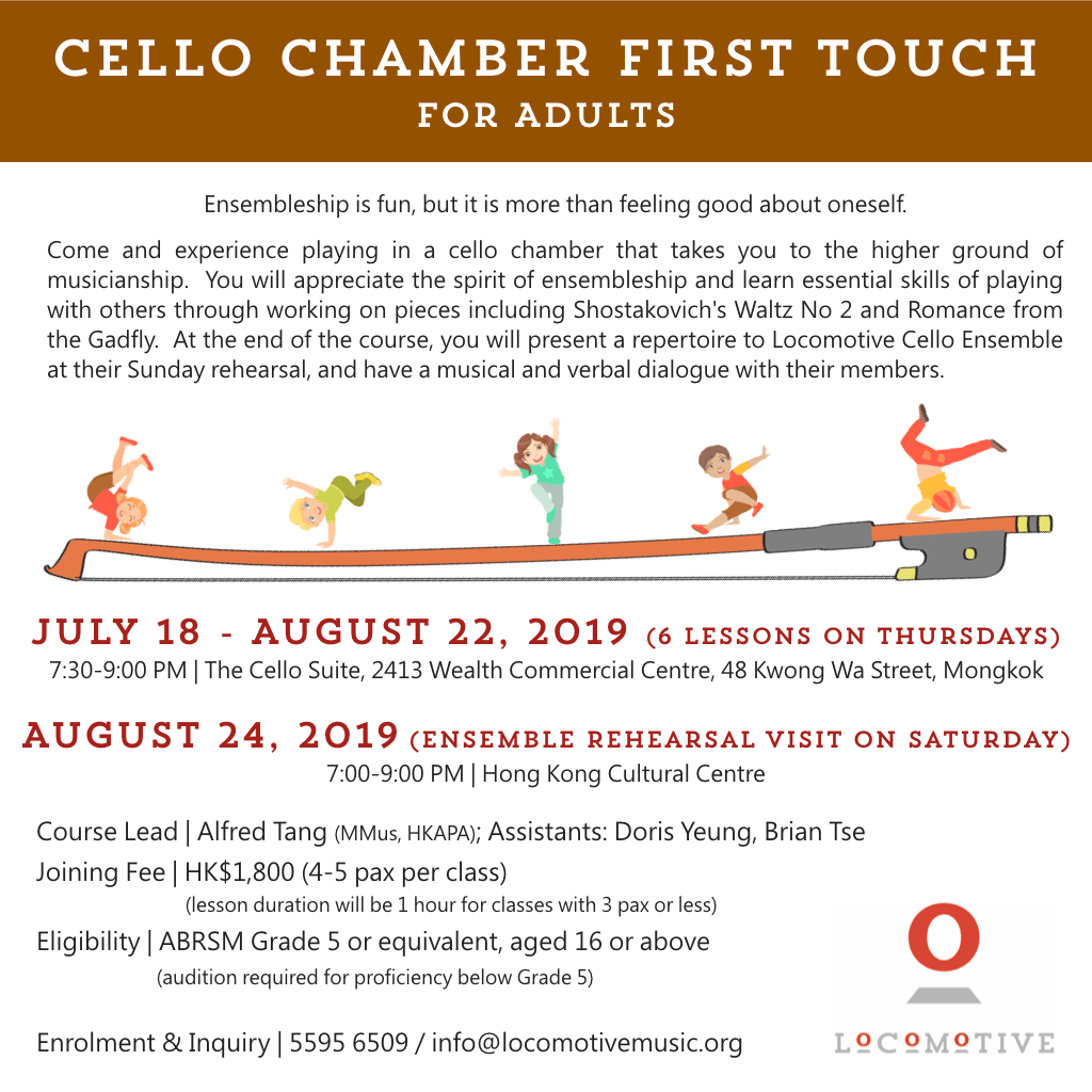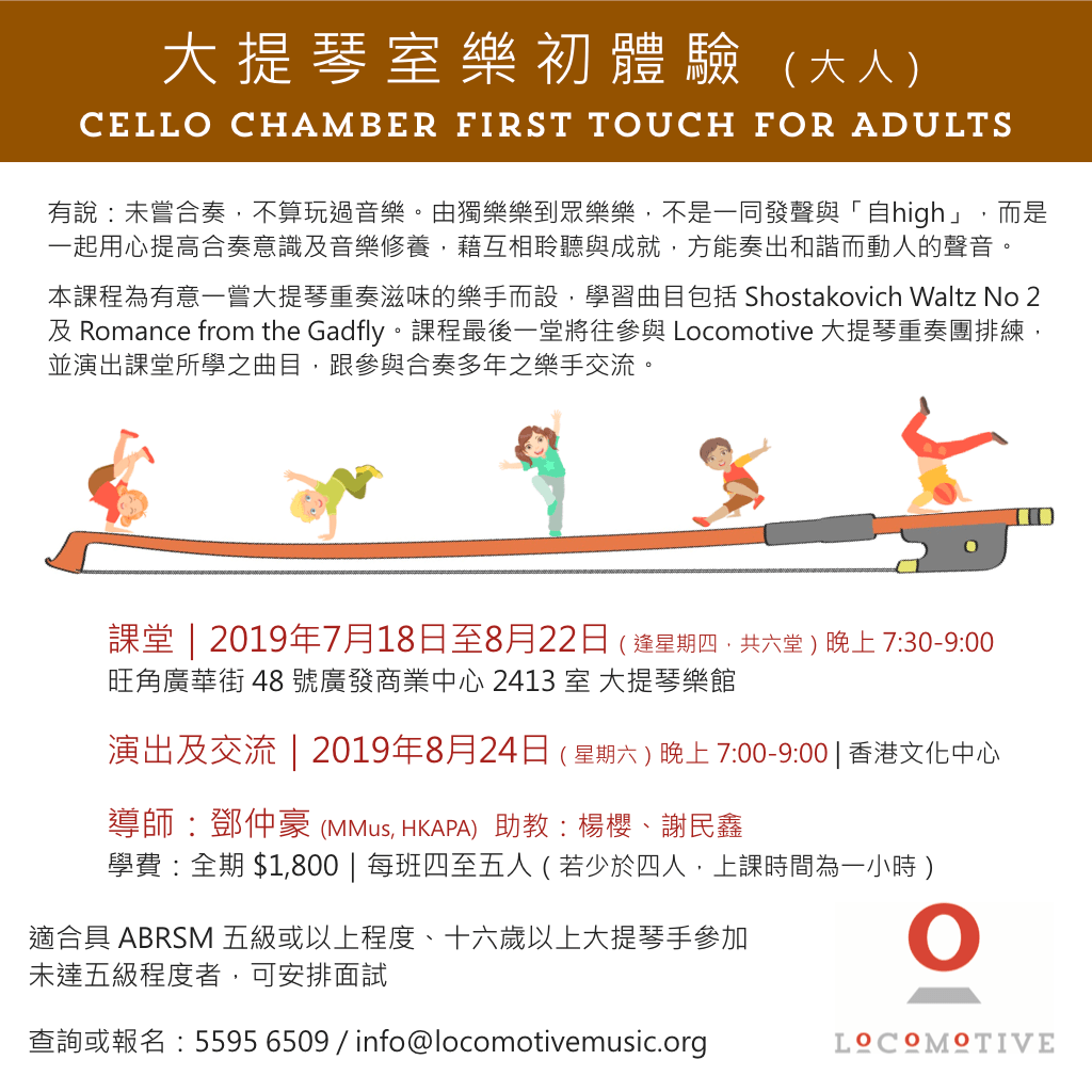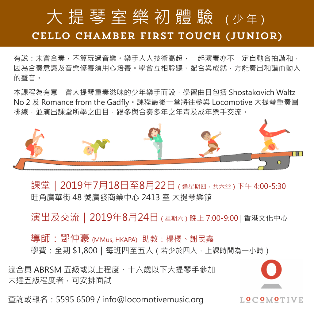 2019-05-152019-10-02Locomotive Music在 大提琴室樂初體驗 暑期班 發表留言 大提琴室樂初體驗 暑期班 Locomotive 首度為有意一嘗合奏滋味的樂手舉辦 Cello Chamber First Touch 課程,分為大人班和少年班,名額有限,報名從速啊~ 分享此文: 分享到 X(在新視窗中開啟) X 分享到 Facebook(在新視窗中開啟) Facebook 喜歡 正在載入... 相關